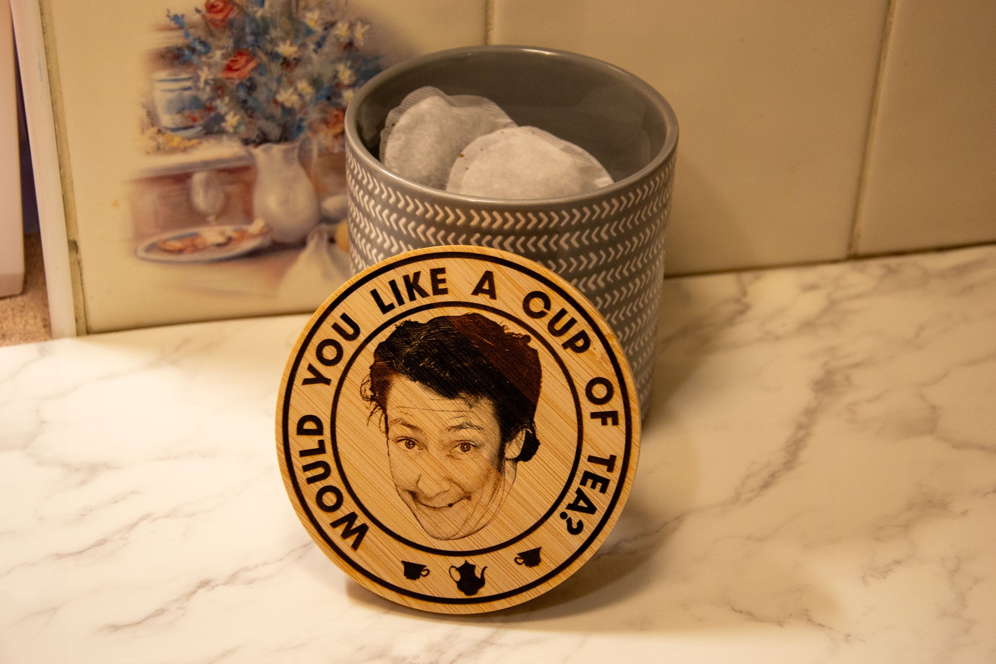 Carefully laser engraved on to the lid, is the cheery face of Mrs Doyle with the "Would you like a cup of tea?" quote surrounding her.
