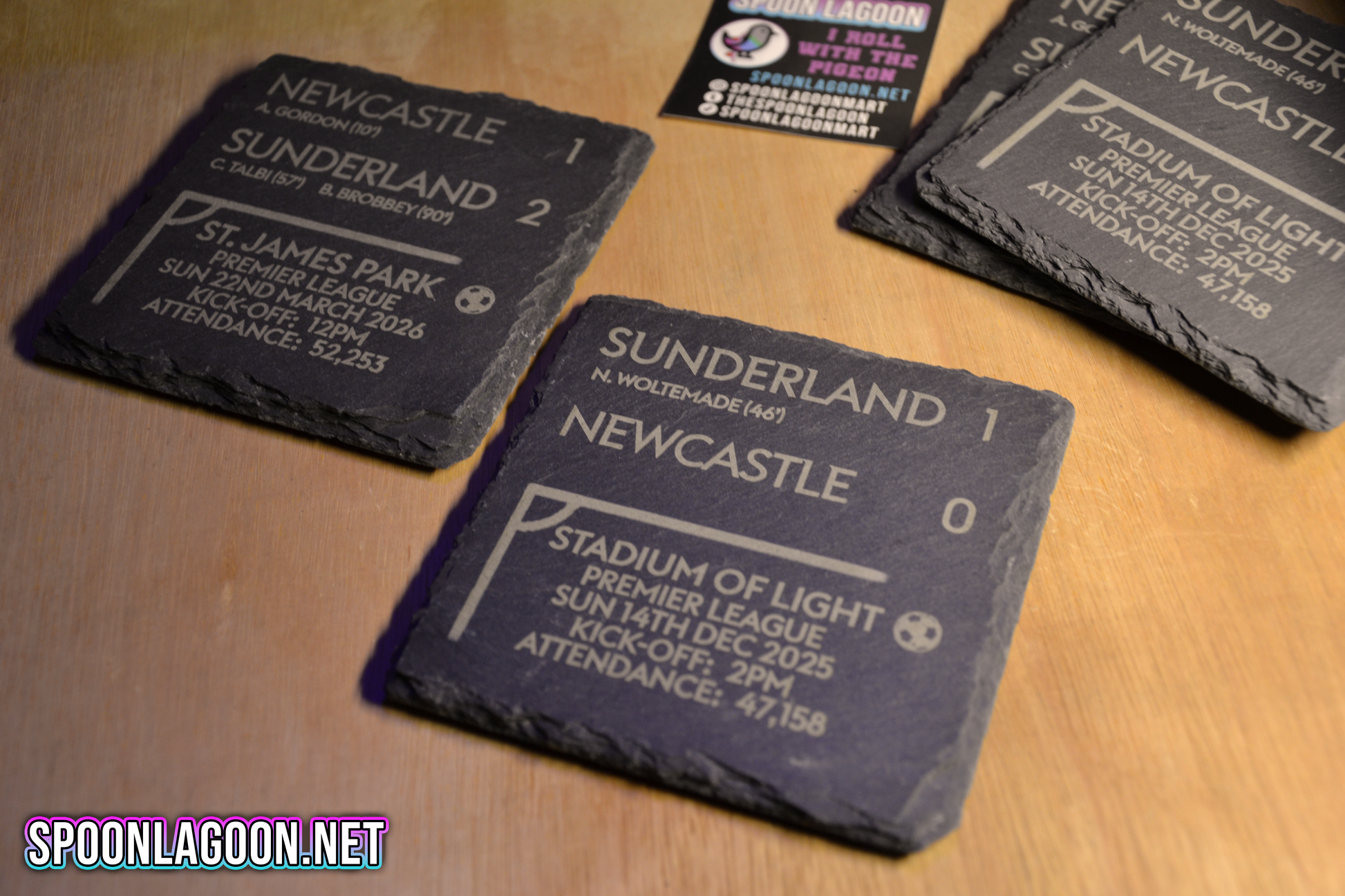 Celebrate Sunderland's huge return to the Premier League and claiming a massive double over rivals Newcastle, with these luxury laser engraved commemorative slate coasters.